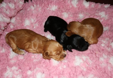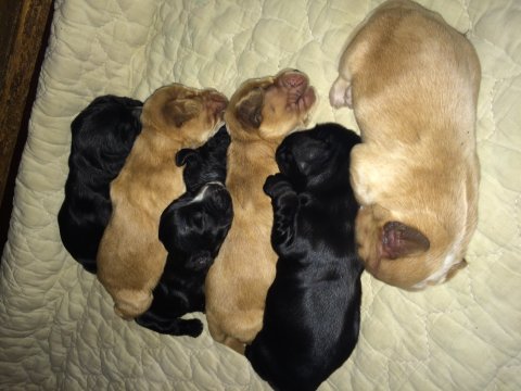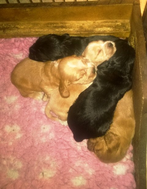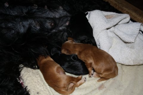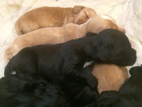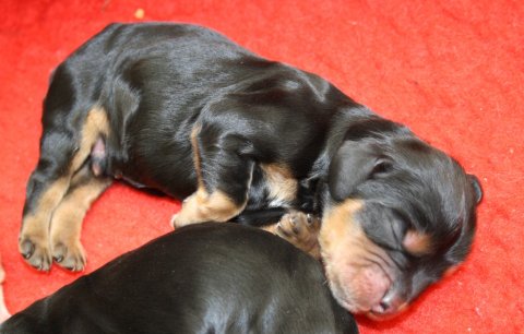 Emily har født 5 sunde og raske hvalpe. 2 røde hanner, 2 sorte hanner og 1 rød tæve.